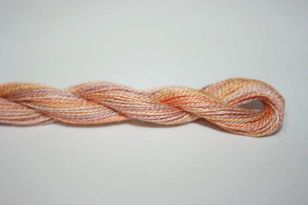 This is Wildflowers from Caron Collection in color 186 Papaya. Rich variegated colors in thin cotton. 3 or 4 ply on 13 mesh, 1 or 2 ply on 18 mesh. About equivalent in size to #8 Perle Cotton.