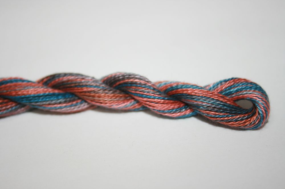 This is Wildflowers from Enriched Threads Caron Collection in color 198 Arroya. Rich variegated colors in thin cotton. 3 or 4 ply on 13 mesh, 1 or 2 ply on 18 mesh. About equivalent in size to #8 Perle Cotton.
