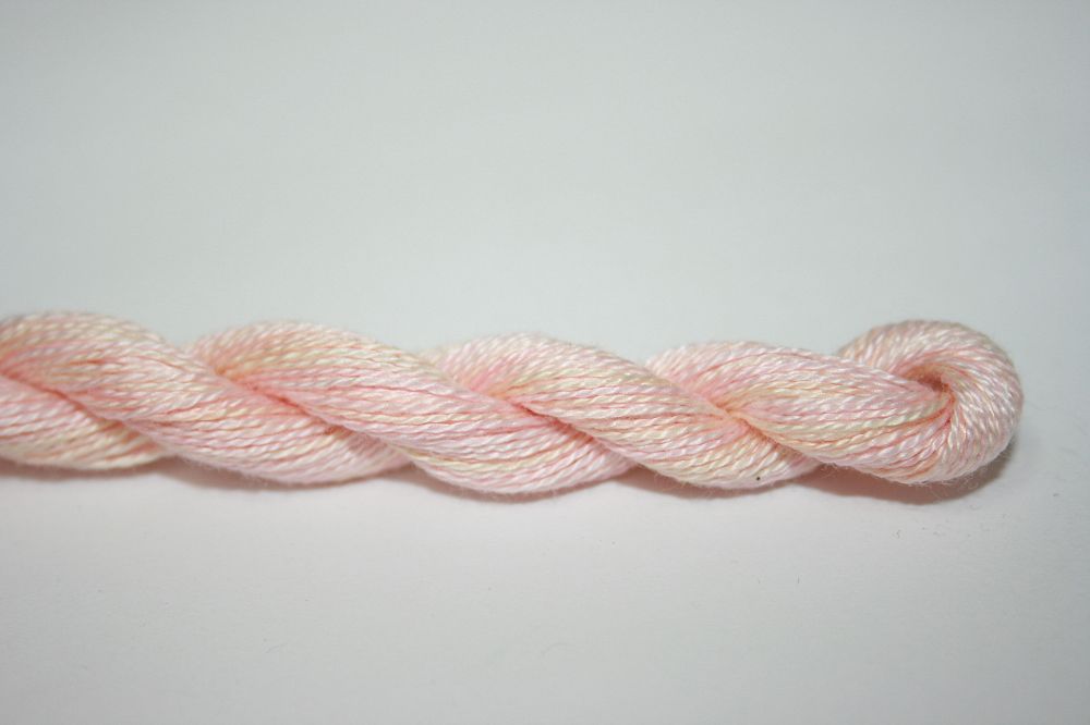 This is Wildflowers from Enriched Threads Caron Collection in color 202 Peach Cobbler. Rich variegated colors in thin cotton. 3 or 4 ply on 13 mesh, 1 or 2 ply on 18 mesh. About equivalent in size to #8 Perle Cotton.