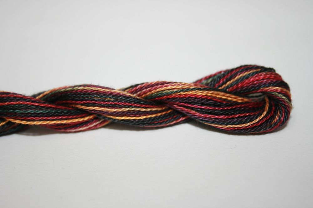 This is Wildflowers from Caron Collection in color 220 Cheyenne. Rich variegated colors in thin cotton. 3 or 4 ply on 13 mesh, 1 or 2 ply on 18 mesh. About equivalent in size to #8 Perle Cotton.