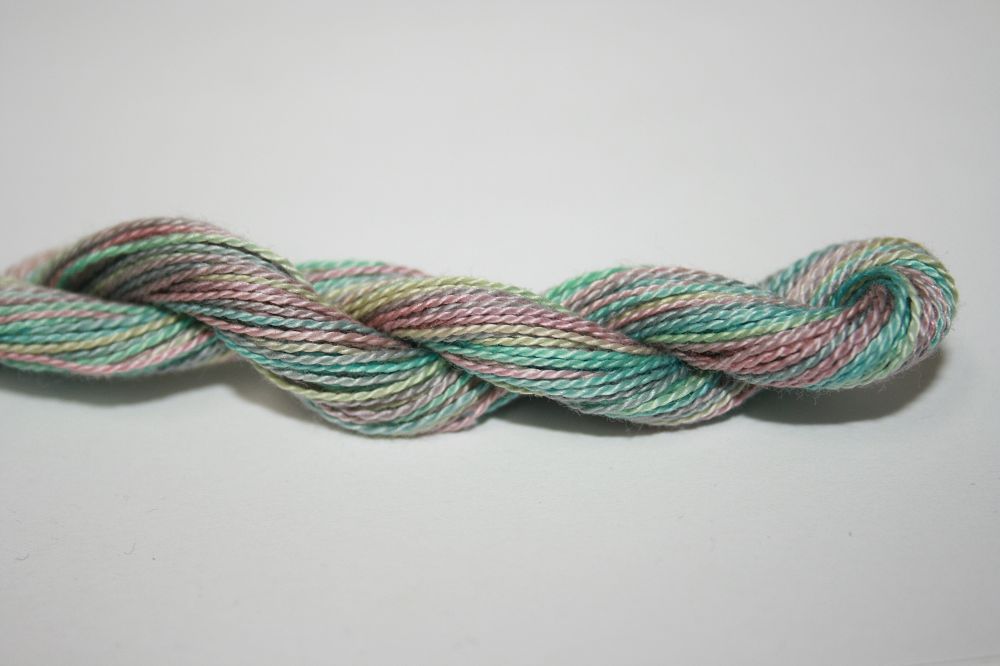 This is Wildflowers from Caron Collection in color 227 Desert Shadow. Rich variegated colors in thin cotton. 3 or 4 ply on 13 mesh, 1 or 2 ply on 18 mesh. About equivalent in size to #8 Perle Cotton.