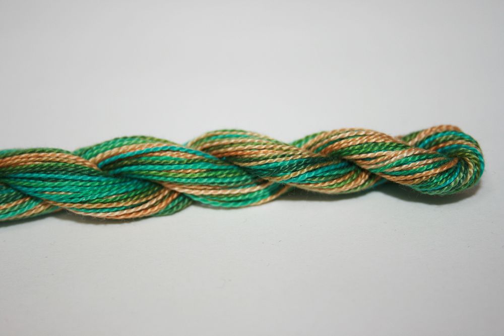 This is Wildflowers from Caron Collection in color 245 Savannah. Rich variegated colors in thin cotton. 3 or 4 ply on 13 mesh, 1 or 2 ply on 18 mesh. About equivalent in size to #8 Perle Cotton.