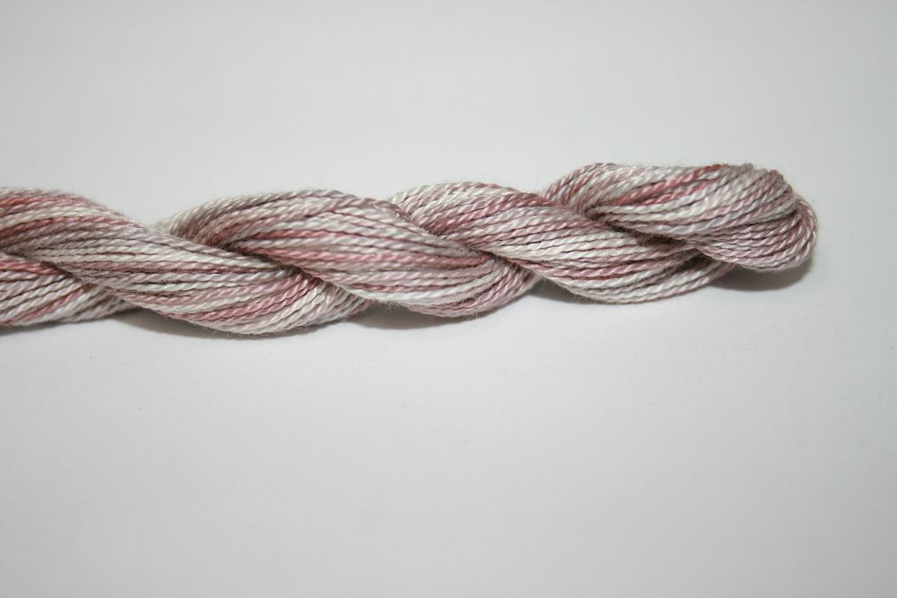 This is Wildflowers from Caron Collection in color 246 Suede. Rich variegated colors in thin cotton. 3 or 4 ply on 13 mesh, 1 or 2 ply on 18 mesh. About equivalent in size to #8 Perle Cotton.