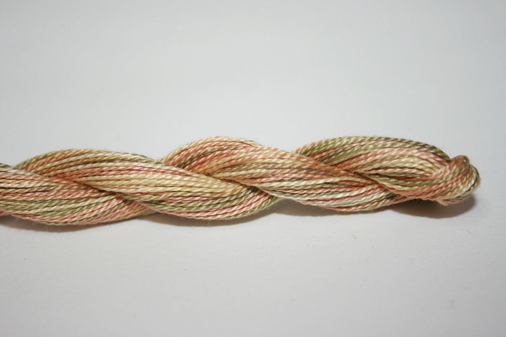 This is Wildflowers from Caron Collection in color 252 Prairie Grass. Rich variegated colors in thin cotton. 3 or 4 ply on 13 mesh, 1 or 2 ply on 18 mesh. About equivalent in size to #8 Perle Cotton.