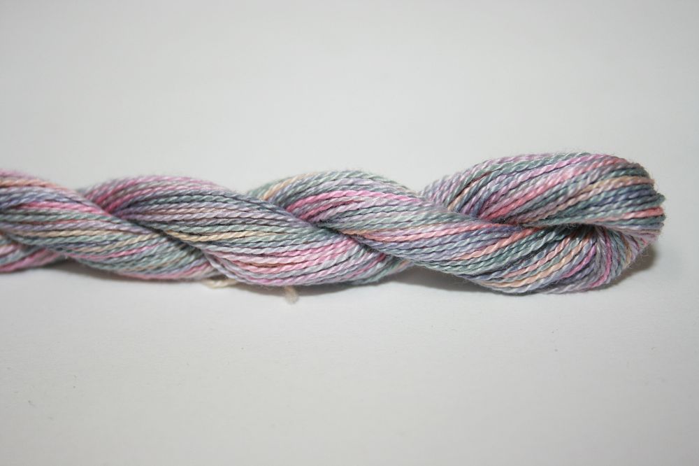 This is Wildflowers from Caron Collection in color 268 Sahara Sunrise. Rich variegated colors in thin cotton. 3 or 4 ply on 13 mesh, 1 or 2 ply on 18 mesh. About equivalent in size to #8 Perle Cotton.