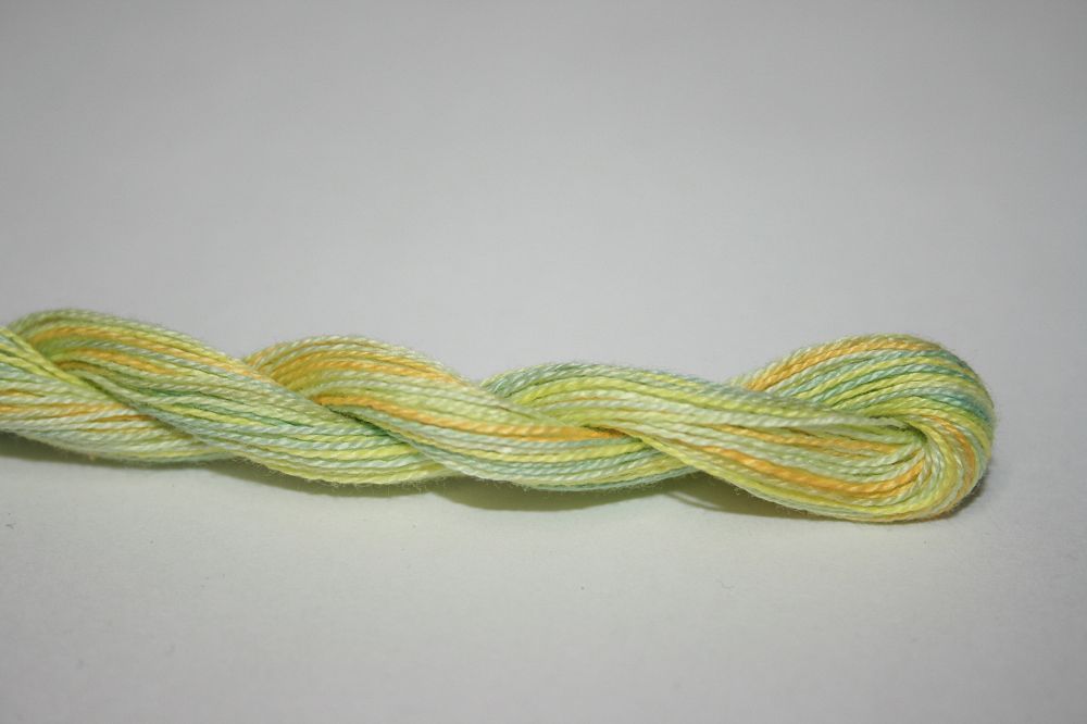 This is Wildflowers from Caron Collection in color 027 Lemon n Lime. Rich variegated colors in thin cotton. 3 or 4 ply on 13 mesh, 1 or 2 ply on 18 mesh. About equivalent in size to #8 Perle Cotton.