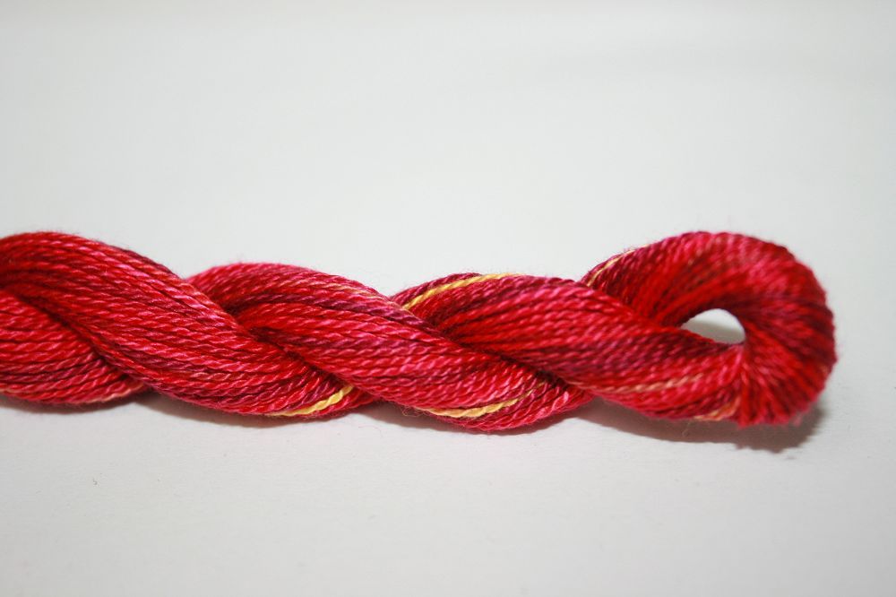 This is Wildflowers from Caron Collection in color 277 Hot Peppers. Rich variegated colors in thin cotton. 3 or 4 ply on 13 mesh, 1 or 2 ply on 18 mesh. About equivalent in size to #8 Perle Cotton.
