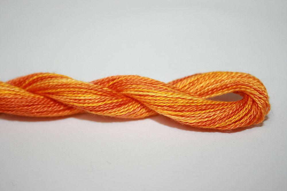 This is Wildflowers from Enriched Threads Caron Collection in color 280 Calabasa. Rich variegated colors in thin cotton. 3 or 4 ply on 13 mesh, 1 or 2 ply on 18 mesh. About equivalent in size to #8 Perle Cotton.