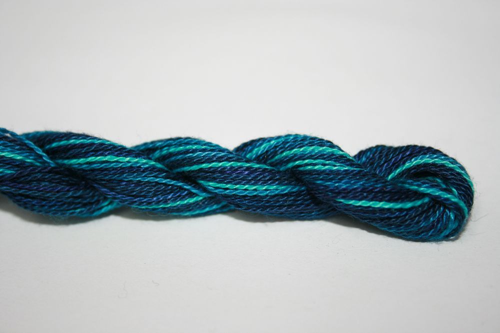 This is Wildflowers from Caron Collection in color 281 Hudson Bay. Rich variegated colors in thin cotton. 3 or 4 ply on 13 mesh, 1 or 2 ply on 18 mesh. About equivalent in size to #8 Perle Cotton.