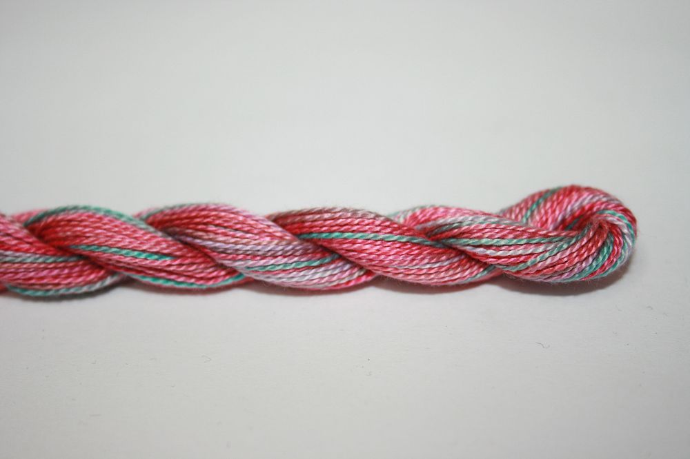 This is Wildflowers from Caron Collection in color 292 Lollipop. Rich variegated colors in thin cotton. 3 or 4 ply on 13 mesh, 1 or 2 ply on 18 mesh. About equivalent in size to #8 Perle Cotton.