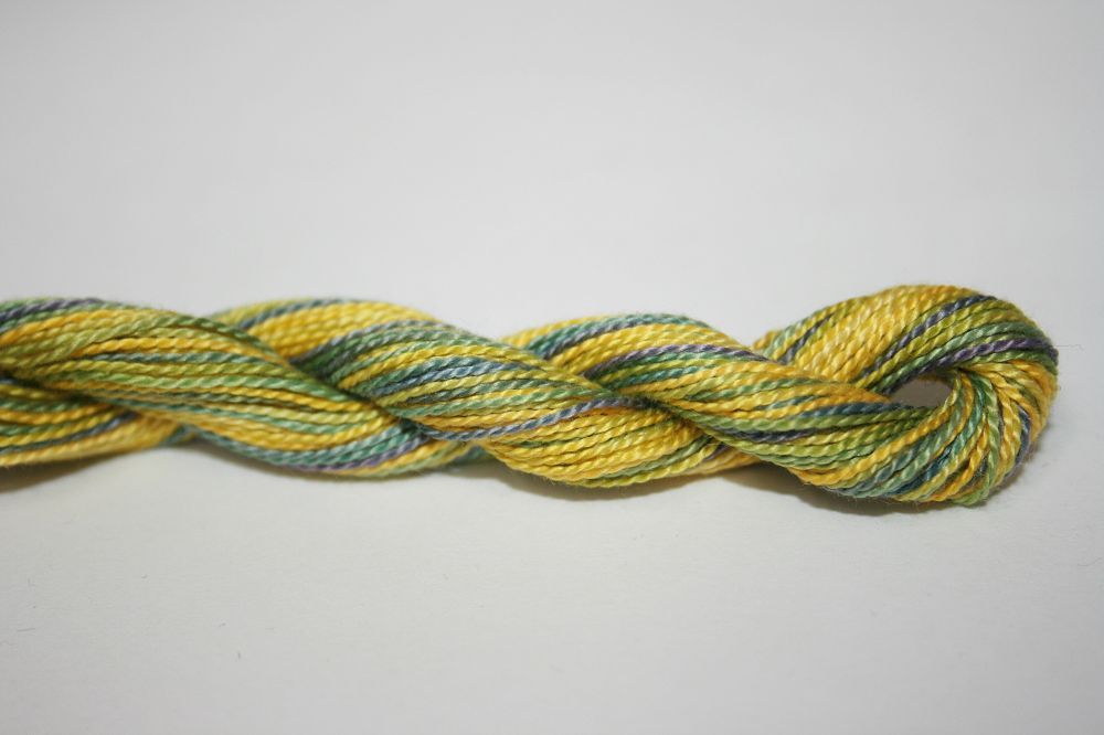 This is Wildflowers from Caron Collection in color 297 Goldenrod. Rich variegated colors in thin cotton. 3 or 4 ply on 13 mesh, 1 or 2 ply on 18 mesh. About equivalent in size to #8 Perle Cotton.