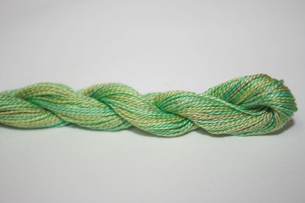 This is Wildflowers from Caron Collection in color 309 Creme de Menthe. Rich variegated colors in thin cotton. 3 or 4 ply on 13 mesh, 1 or 2 ply on 18 mesh. About equivalent in size to #8 Perle Cotton.