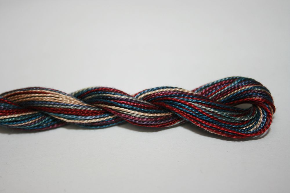 This is Wildflowers from Caron Collection in color 321 Kelsch. Rich variegated colors in thin cotton. 3 or 4 ply on 13 mesh, 1 or 2 ply on 18 mesh. About equivalent in size to #8 Perle Cotton.