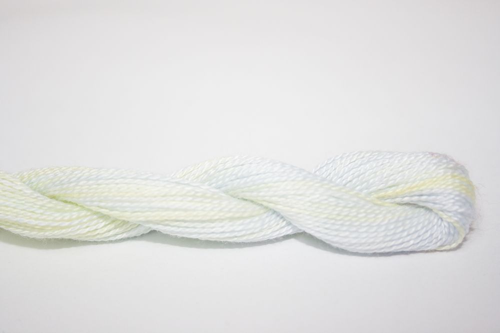 This is Wildflowers from Caron Collection in color 330 Lily of the Val. Rich variegated colors in thin cotton. 3 or 4 ply on 13 mesh, 1 or 2 ply on 18 mesh. About equivalent in size to #8 Perle Cotton.