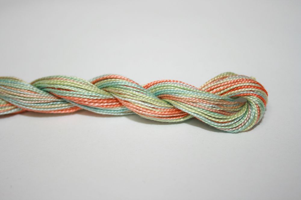 This is Wildflowers from Caron Collection in color 331 Summer Fields. Rich variegated colors in thin cotton. 3 or 4 ply on 13 mesh, 1 or 2 ply on 18 mesh. About equivalent in size to #8 Perle Cotton.