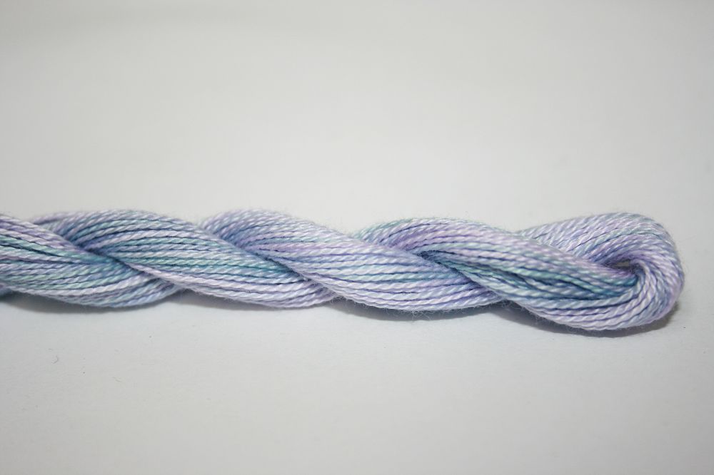 This is Wildflowers from Caron Collection in color 333 Blue Ridge Mt.. Rich variegated colors in thin cotton. 3 or 4 ply on 13 mesh, 1 or 2 ply on 18 mesh. About equivalent in size to #8 Perle Cotton.