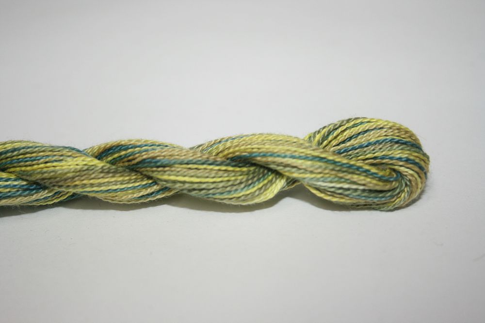 This is Wildflowers from Caron Collection in color 339 Zucchini. Rich variegated colors in thin cotton. 3 or 4 ply on 13 mesh, 1 or 2 ply on 18 mesh. About equivalent in size to #8 Perle Cotton.