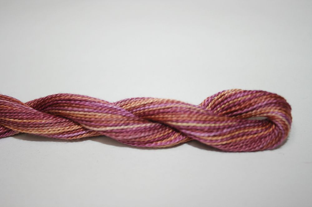 This is Wildflowers from Caron Collection in color 340 Brandywine. Rich variegated colors in thin cotton. 3 or 4 ply on 13 mesh, 1 or 2 ply on 18 mesh. About equivalent in size to #8 Perle Cotton.