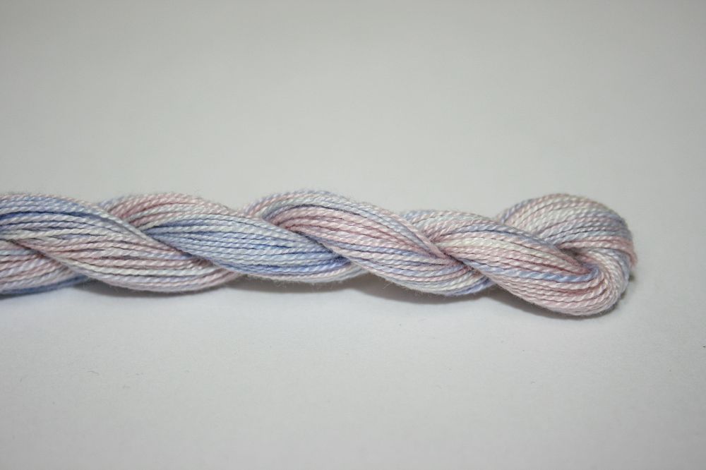 This is Wildflowers from Caron Collection in color 038 Morning Mist. Rich variegated colors in thin cotton. 3 or 4 ply on 13 mesh, 1 or 2 ply on 18 mesh. About equivalent in size to #8 Perle Cotton.