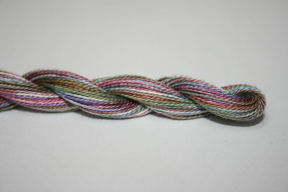 This is Wildflowers from Caron Collection in color 039 Lilac. Rich variegated colors in thin cotton. 3 or 4 ply on 13 mesh, 1 or 2 ply on 18 mesh. About equivalent in size to #8 Perle Cotton.