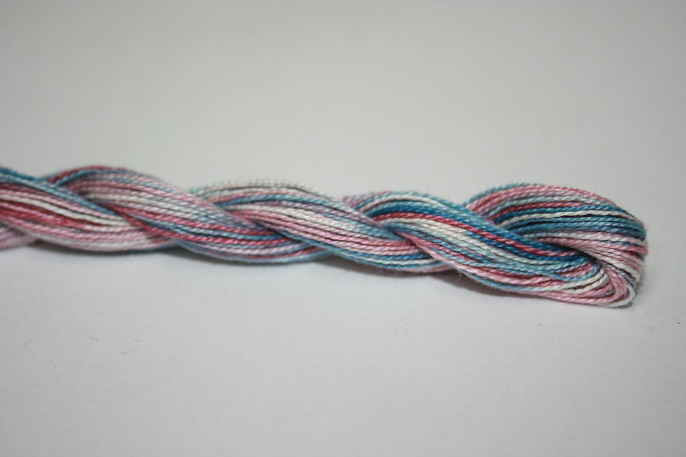 This is Wildflowers from Enriched Threads Caron Collection in color 040 Williamsburg. Rich variegated colors in thin cotton. 3 or 4 ply on 13 mesh, 1 or 2 ply on 18 mesh. About equivalent in size to #8 Perle Cotton.