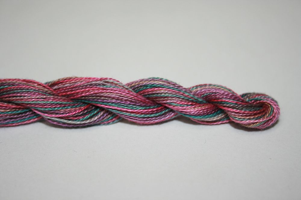 This is Wildflowers from Caron Collection in color 043 Aurora. Rich variegated colors in thin cotton. 3 or 4 ply on 13 mesh, 1 or 2 ply on 18 mesh. About equivalent in size to #8 Perle Cotton.