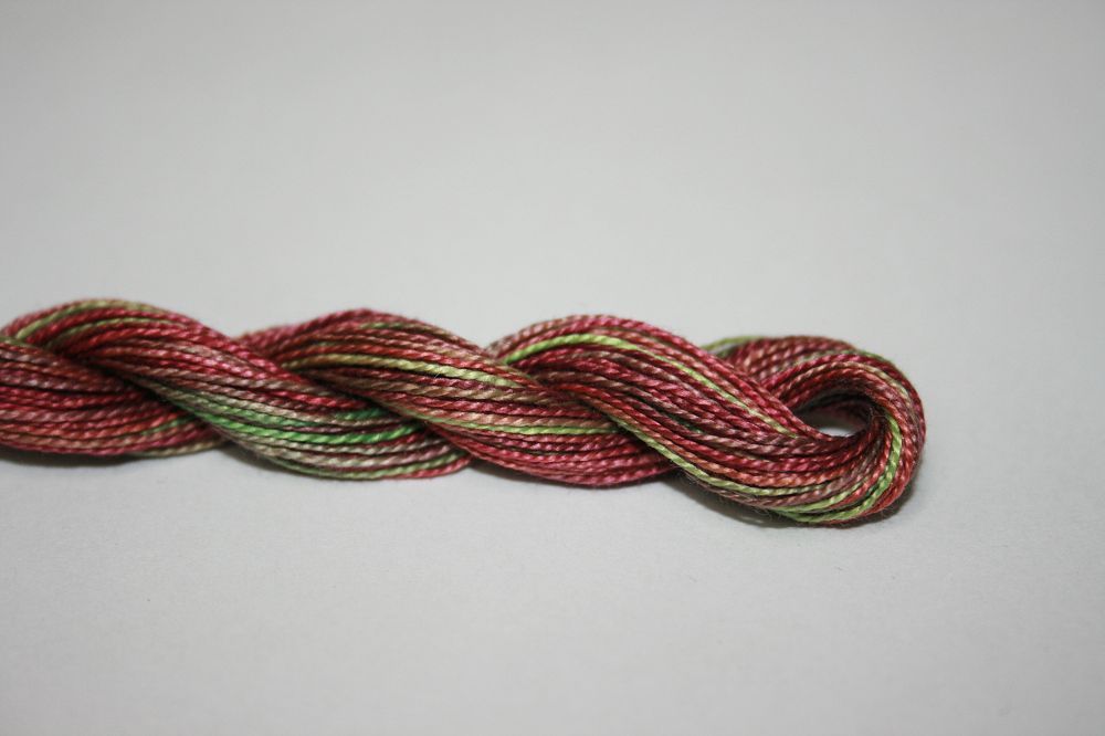 This is Wildflowers from Caron Collection in color 047 Camouflage. Rich variegated colors in thin cotton. 3 or 4 ply on 13 mesh, 1 or 2 ply on 18 mesh. About equivalent in size to #8 Perle Cotton.