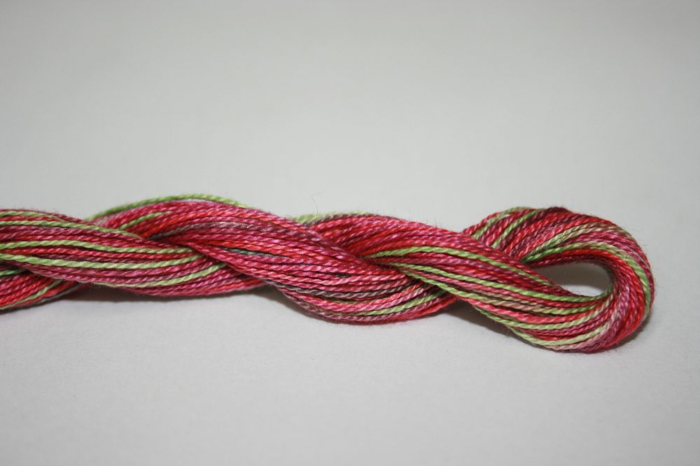 This is Wildflowers from Caron Collection in color 056 Potpourri. Rich variegated colors in thin cotton. 3 or 4 ply on 13 mesh, 1 or 2 ply on 18 mesh. About equivalent in size to #8 Perle Cotton.