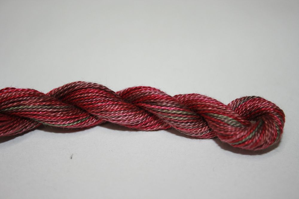 This is Wildflowers from Caron Collection in color 058 Mocha Rose. Rich variegated colors in thin cotton. 3 or 4 ply on 13 mesh, 1 or 2 ply on 18 mesh. About equivalent in size to #8 Perle Cotton.