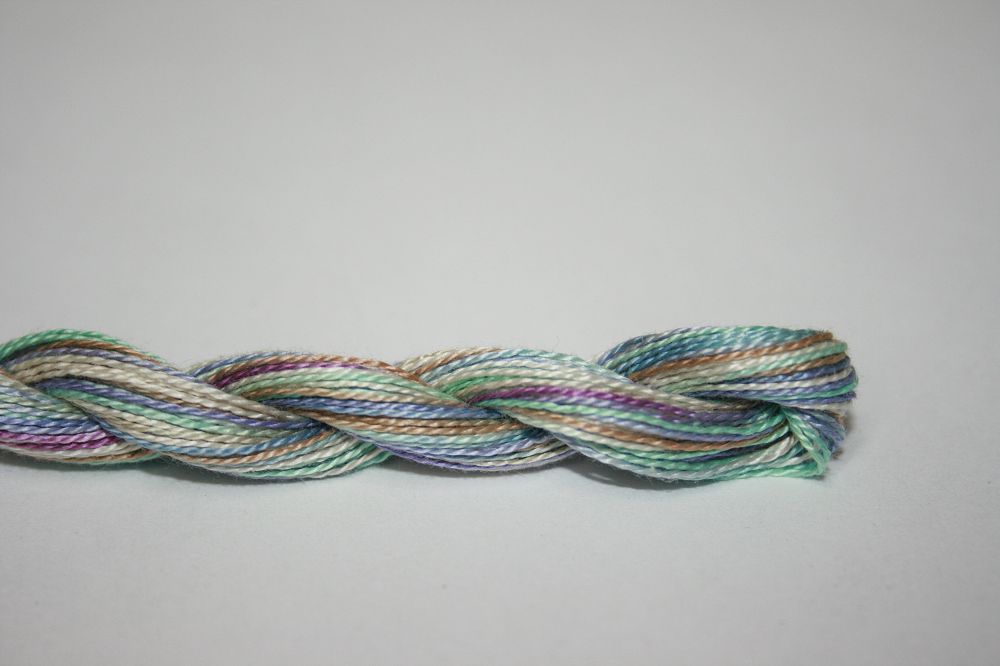 This is Wildflowers from Caron Collection in color 007 Pistachio Nut. Rich variegated colors in thin cotton. 3 or 4 ply on 13 mesh, 1 or 2 ply on 18 mesh. About equivalent in size to #8 Perle Cotton.