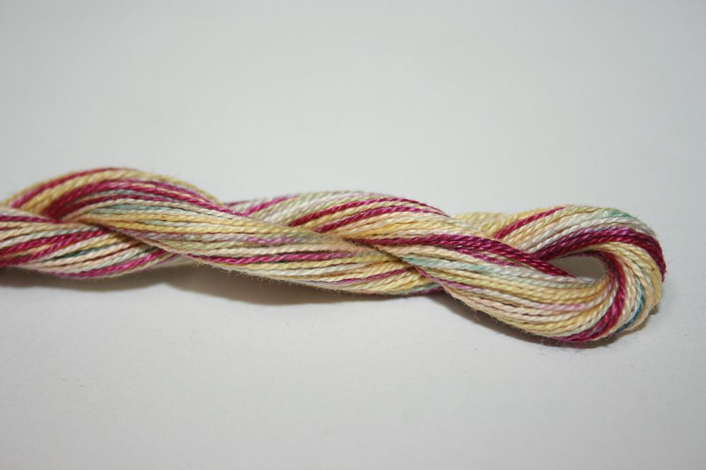 This is Wildflowers from Caron Collection in color 071 Ambrosia. Rich variegated colors in thin cotton. 3 or 4 ply on 13 mesh, 1 or 2 ply on 18 mesh. About equivalent in size to #8 Perle Cotton.