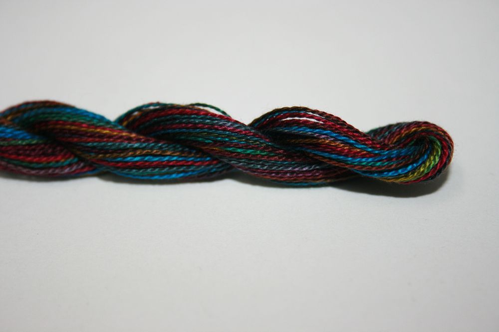 This is Wildflowers from Enriched Threads Caron Collection in color 077 Royal Jewels. Rich variegated colors in thin cotton. 3 or 4 ply on 13 mesh, 1 or 2 ply on 18 mesh. About equivalent in size to #8 Perle Cotton.