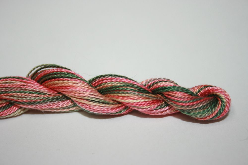 This is Wildflowers from Caron Collection in color 088 Mountain Meadow. Rich variegated colors in thin cotton. 3 or 4 ply on 13 mesh, 1 or 2 ply on 18 mesh. About equivalent in size to #8 Perle Cotton.