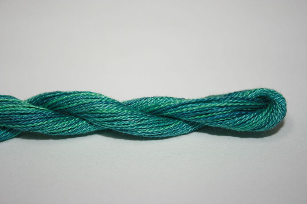This is Wildflowers from Caron Collection in color 089 Caribbean. Rich variegated colors in thin cotton. 3 or 4 ply on 13 mesh, 1 or 2 ply on 18 mesh. About equivalent in size to #8 Perle Cotton.