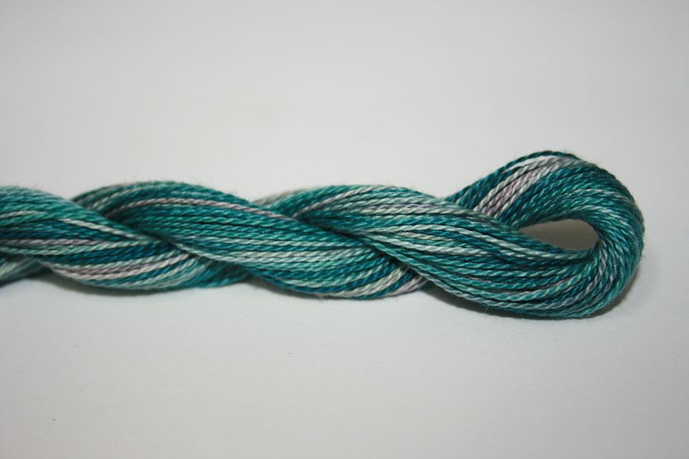 This is Wildflowers from Caron Collection in color 091 Blue Spruce. Rich variegated colors in thin cotton. 3 or 4 ply on 13 mesh, 1 or 2 ply on 18 mesh. About equivalent in size to #8 Perle Cotton.