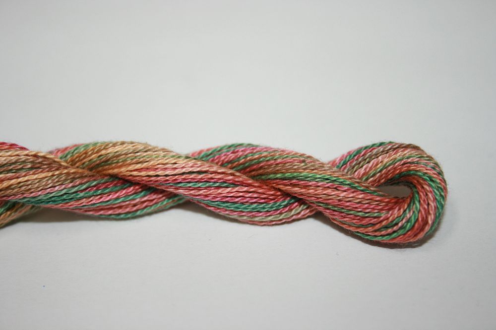 This is Wildflowers from Caron Collection in color 093 Painted Desert. Rich variegated colors in thin cotton. 3 or 4 ply on 13 mesh, 1 or 2 ply on 18 mesh. About equivalent in size to #8 Perle Cotton.