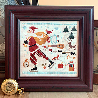 This is a printed cross stitch pattern by Carriage House Samplings. It features a skating Santa Clause carrying a sack of presents and followed by Christmas-themed items. The example as stitched uses Needlepoint Inc. Silk on 40 count Thornfield by Needle and Flax.