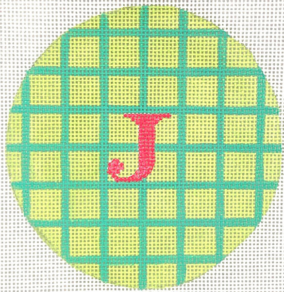 A beautiful hand painted needlepoint canvas from Kate Dickerson Needlepoint Collections. Background pattern only; the letter shown in the photo is only an example. Ask us about custom painting a letter(s) of your choice for an additional cost.
