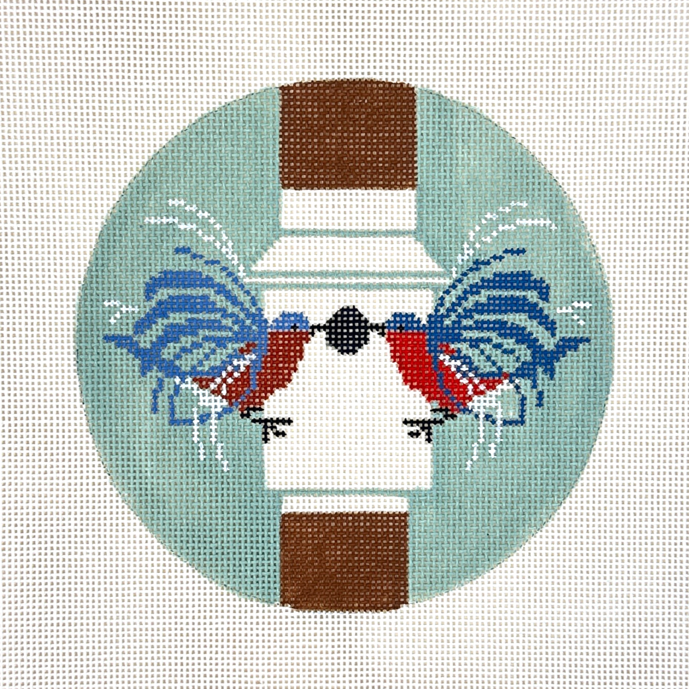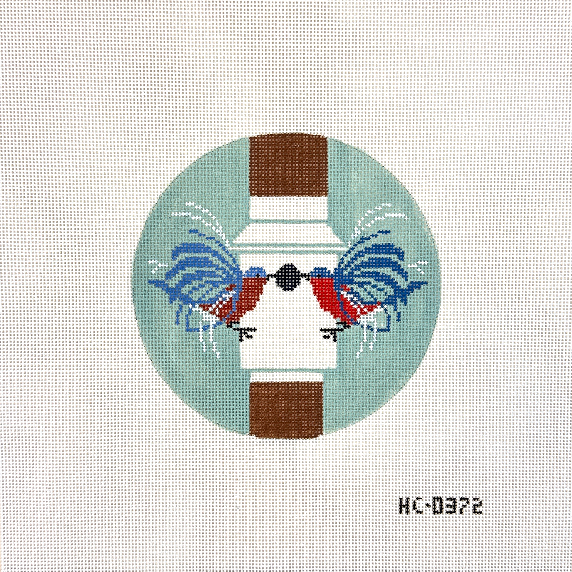 This hand painted needlepoint canvas by Charley Harper features a pair of birds in front of a birdhouse.