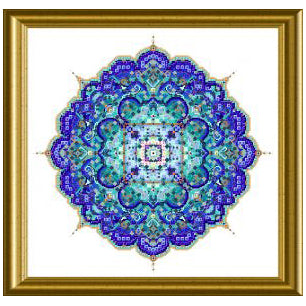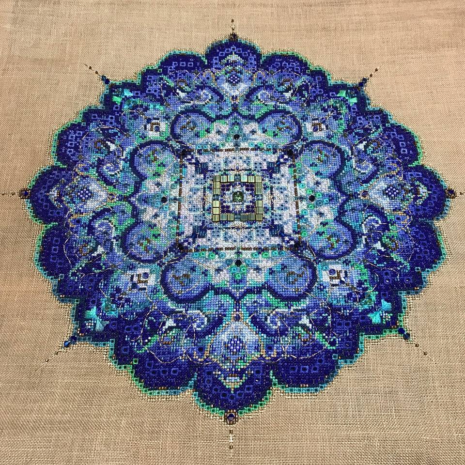 This is a printed cross stitch pattern by Chatelaine Designs. It features a mandala design inspired by a Moroccan lace pattern and highlights the beautiful pattern and color scheme. The pattern calls for Caron Waterlilies Silk, Dinky Dyes Silk, Dinky Dyes Silk Perle, Gloriana Silk, and Rainbow Gallery Petite Silk Lame Braid threads, along with Delica Beads, and Swarovski Crystals, on 32 or 28 count Belfast linen by Zweigart.