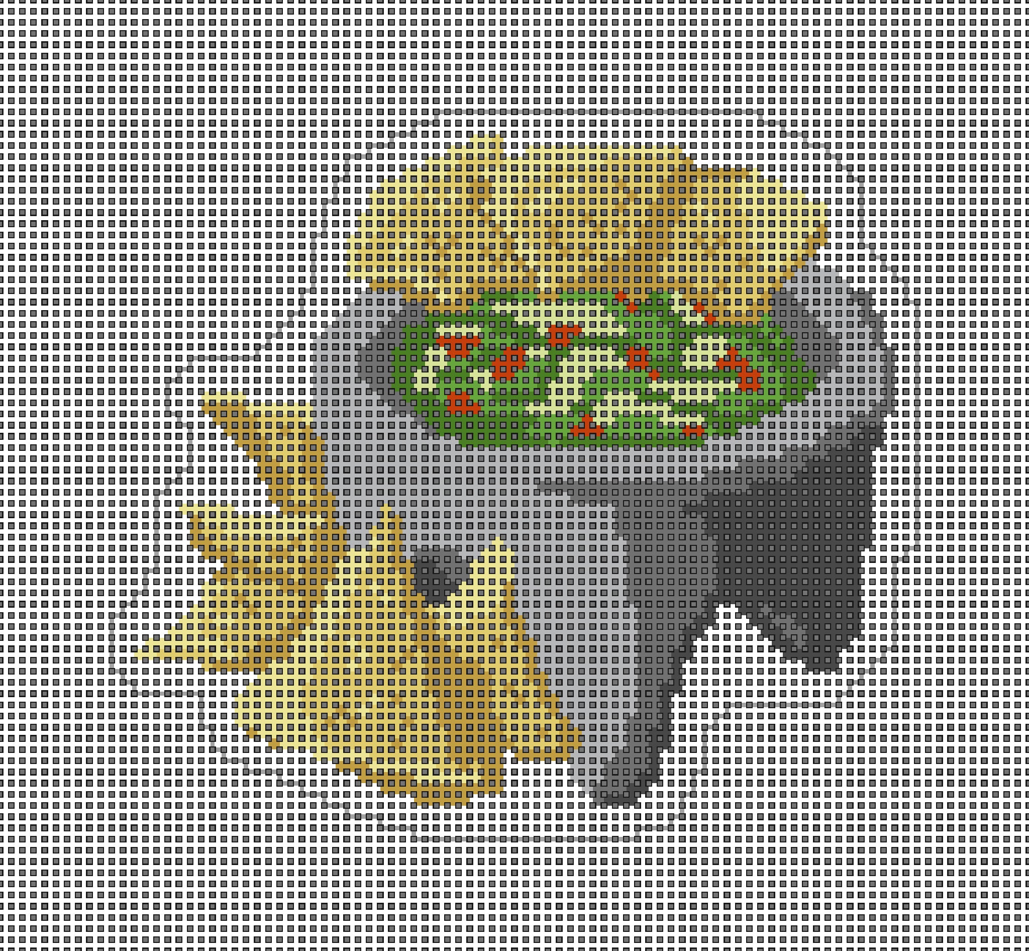 This hand painted needlepoint canvas by Rittenhouse Needlepoint features a molcajete of guacamole with tortilla chips. Guacamole or ahuacamolli originates with the Aztecs in the 1500s. It didn't become widely popular in the US until the early 1990s, after a "Guacamole Bowl" was promoted during the 1992 Superbowl.