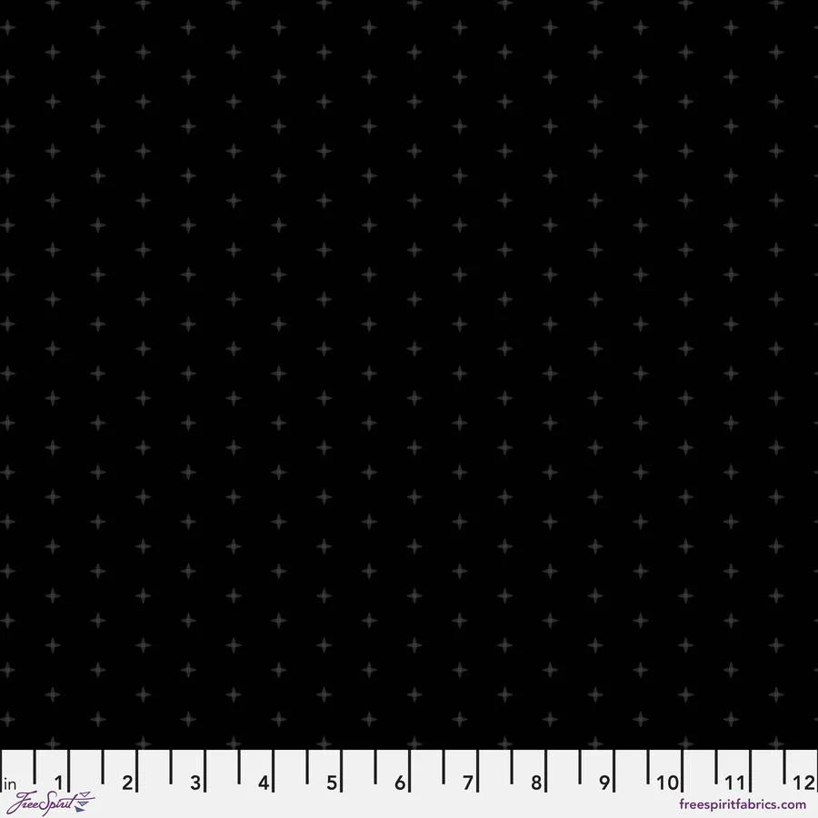 This medium weight cotton fabric by Chromatics features a simple but refined design with grey crosses on a black background.
