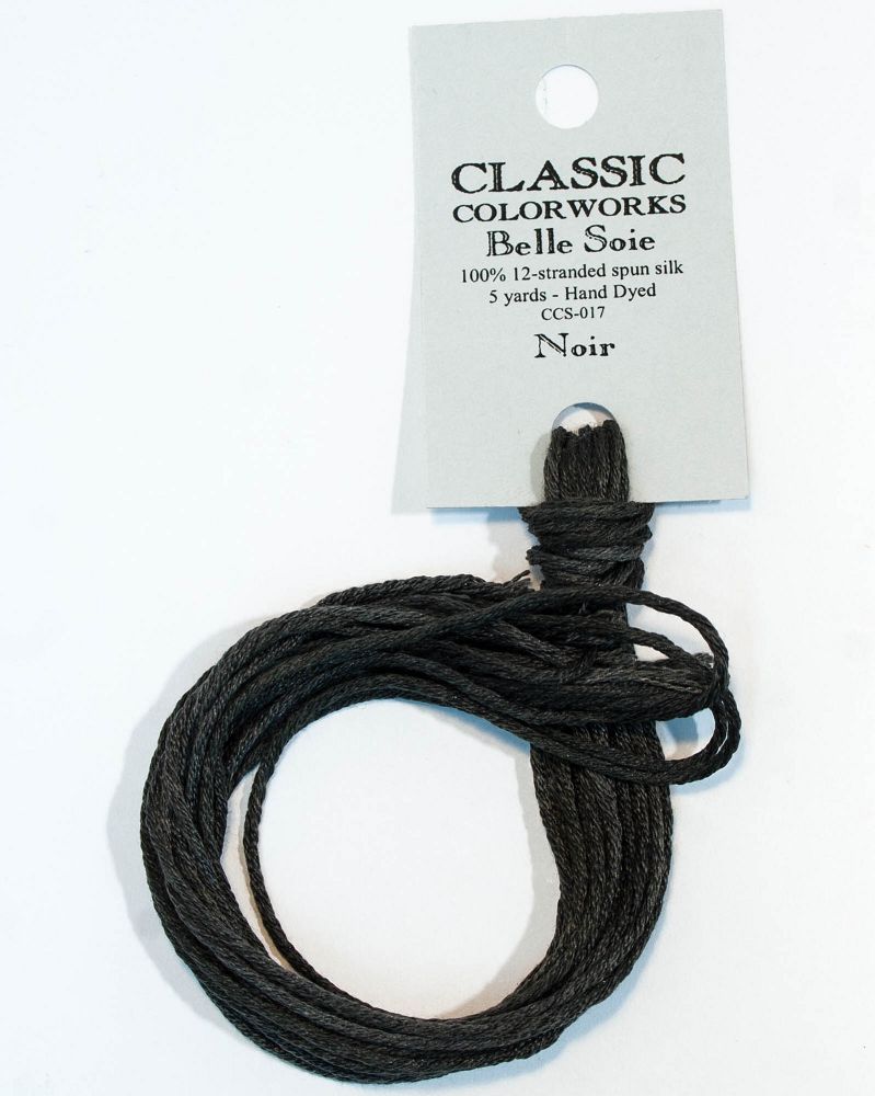 This is Belle Soie from Classic Colorworks in color Noir. Luxurious strandable silk with soft variegation. Perfect for needlepoint, embroidery, and cross stitch! Use 6 strands on 13 mesh, 3 or 4 on 18 mesh.