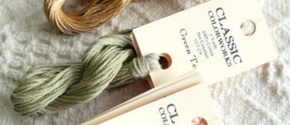 This is Cotton Floss from Classic Coloworks in color Green Tea. An all-encompassing shade range of lightly variegated cottons, from jewel tones to pastels to earthy hues. Use all 6 strands on 13 mesh, 3 or 4 on 18 mesh.