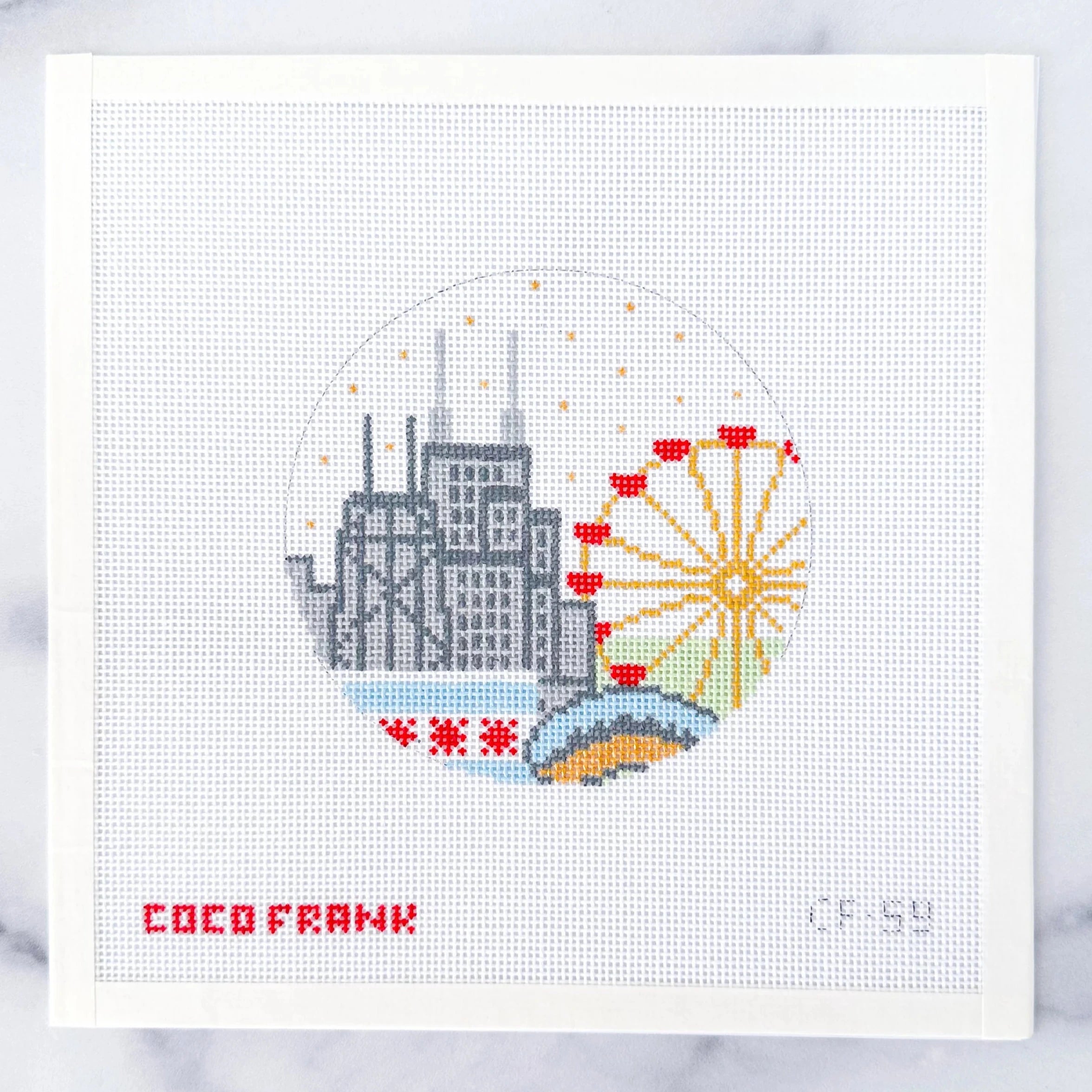 A beautiful hand painted needlepoint design from Coco Frank featuring iconic landmarks of Chicago. Finished examples shown for inspiration, materials and finishing service sold separately.