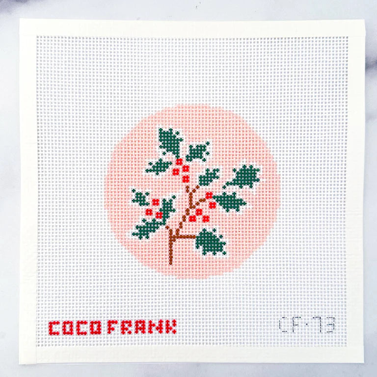 This is a hand painted needlepoint canvas from Coco Frank. It features a branch of holly set to a pink background.