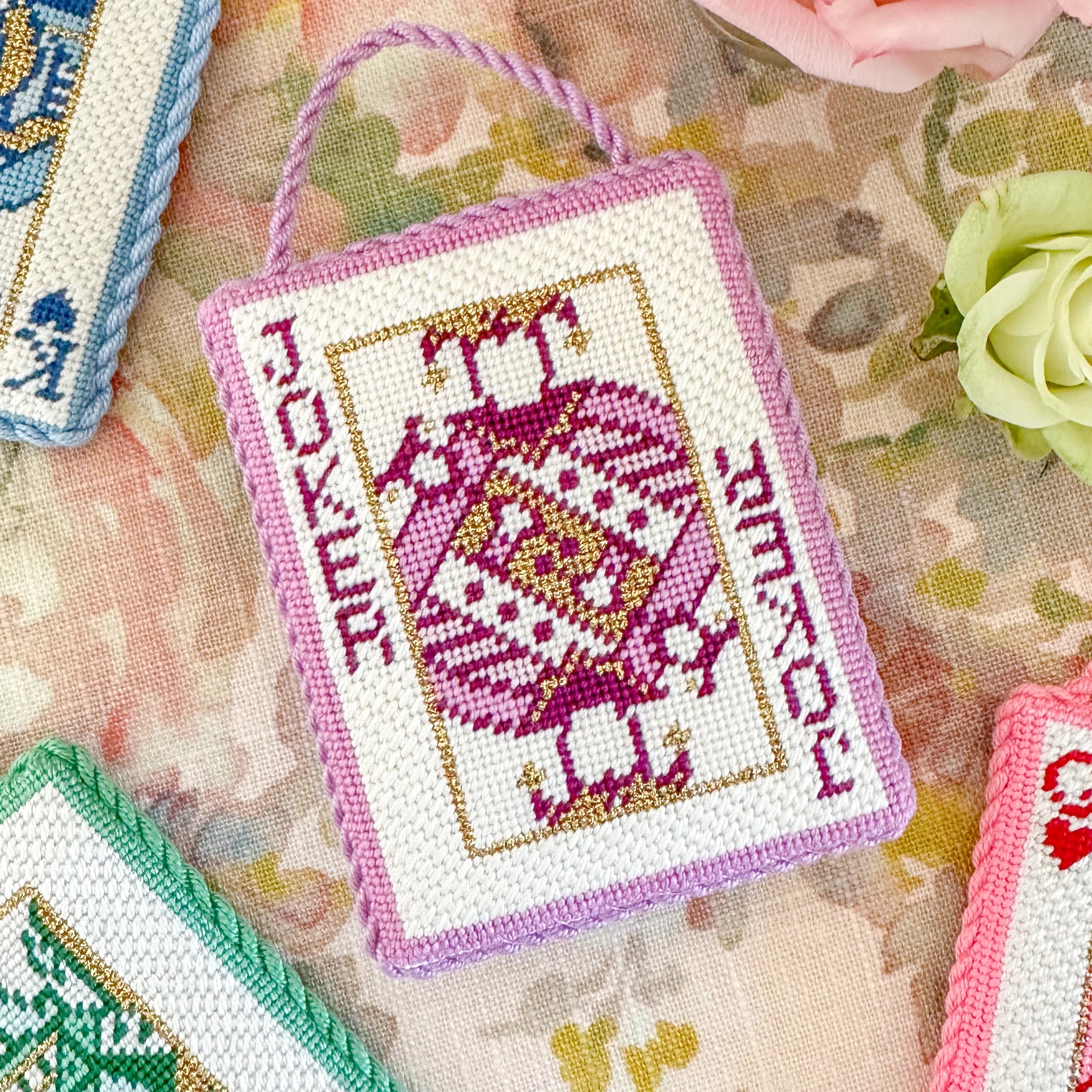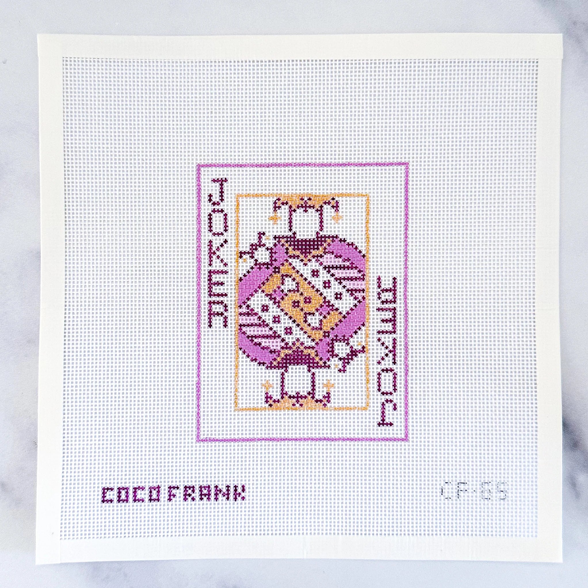 A beautiful hand painted needlepoint design from Coco Frank featuring a Joker card in shades of purple. Finished example shown for inspiration, materials and finishing services sold separately.