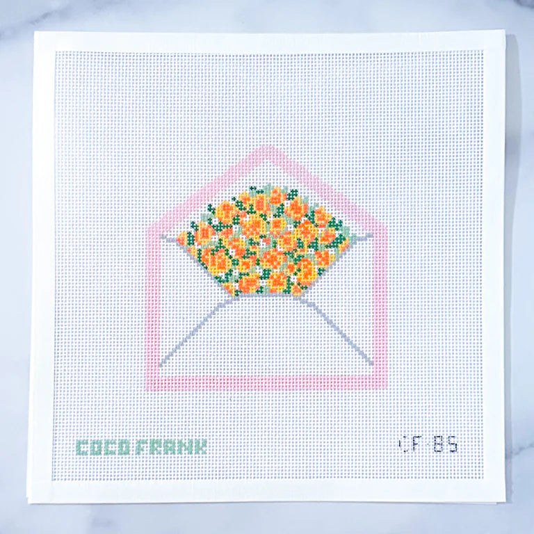 This is a hand painted needlepoint canvas from Coco Frank. It features a pink envelope filled with yellow flowers. Comes with a printed alphabet needlepoint chart to use for personalizing your canvas. These are great for adding a name/initials and date for a wedding, a house number for a new home, or a special message for a loved one (e.g. "I love you," "Best friends," "New Home"). Stitched examples show for inspiration, materials and finishing services sold separately.