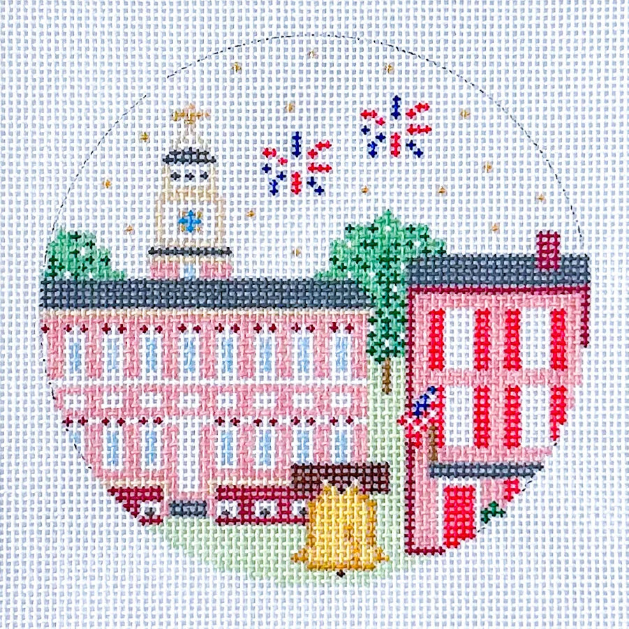 This is a hand painted needlepoint canvas from Coco Frank. It features Philadelphia buildings with fireworks behind them in the sky.