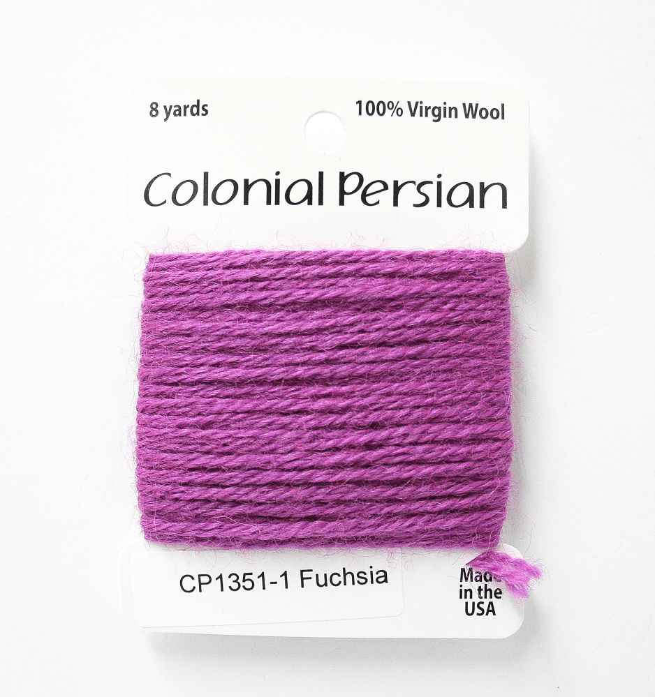 This is Colonial Persian from Colonial Needle Co in color Fuchsia. A traditional needlepoint fiber. Comparable to the now-discontinued Paternayan wool. Use all three strands on 10 mesh, 2 strands on 13 mesh, 1 strand on 18 mesh. 1 strand is about equivilant to 1 strand of crewel wool.